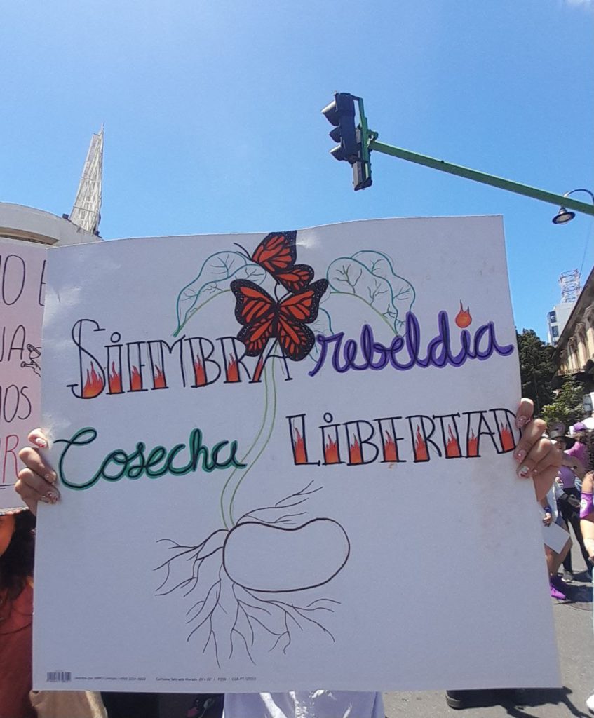 La movilización en San José finaliza en la plaza de la democracia, entre abrazos, risas, reencuentros, discursos, música, actos simbólicos y con una olla común para quien quisiera acercarse a llevar una sopita de vegetales cocinada por la colectividad de Jornadas Solidarias . La comida también es un asunto político