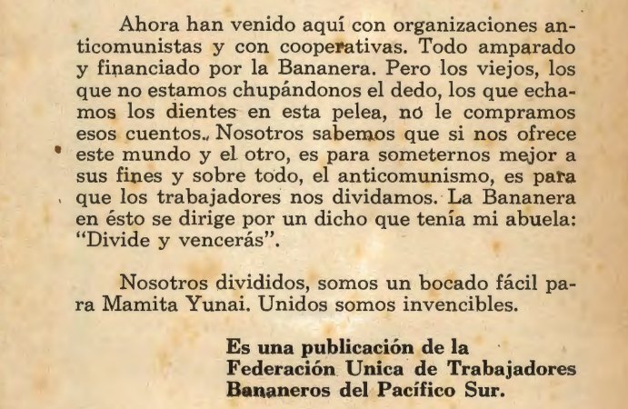 ¿Hoy quién le agradece a las familias de los puertos bananeros que se le plantaron a la mayor empresa transnacional del continente y que, gracias a ellas y ellos, disfrutamos de vacaciones, aguinaldo y salario mínimo? ¿Se imagina ir a trabajar y que le paguen con una bolsa de café y una libra de arroz? A veces creemos que los derechos nos cayeron del cielo o, aún peor, que nos los regalaron los presidentes.